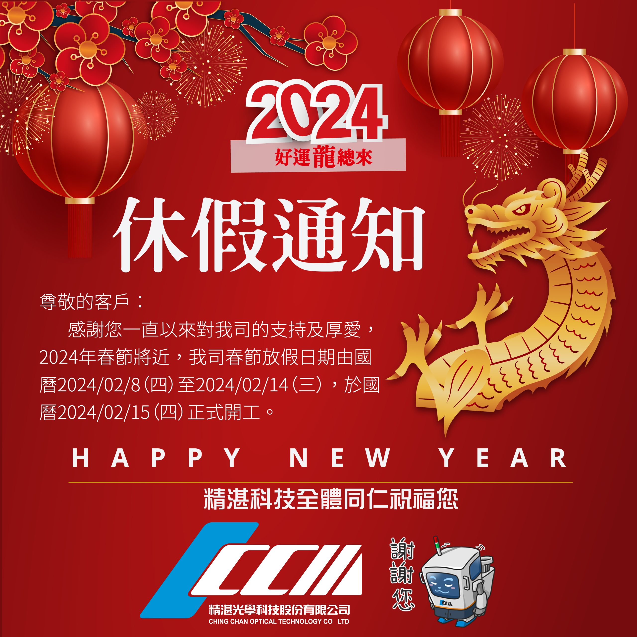 尊敬的客戶:感謝您一直以來對我司的支持及厚愛,2024年春節將近,我司春節放假日期由國曆2024/02/8(四)至2024/02/14(三),於國曆2024/02/15(四)正式開工。在此先跟大家拜個早年,祝大家2024年好運”龍”總來!! 新年快樂!Happy New Year!!!!!